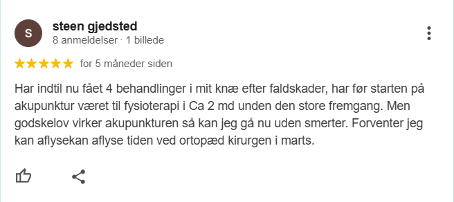 Hos Nyborg Akupunktur tilbyder vi meget effektiv akupunkturbehandling, med stor succes der sigter mod at lindre smerter og forbedre knæets funktion, allerede efter første behandling.
